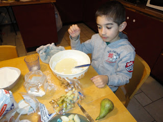 ... abbiamo preso la frutta e con semplici ingredienti abbiamo realizzato una torta con mele e pere ... naturalmente il mio piccolo chef mi ha dato una grande mano nel realizzare la torta ...